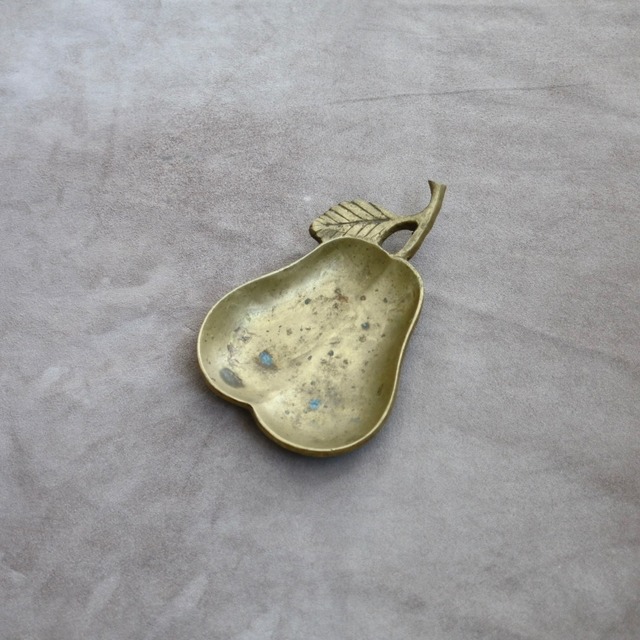 ヴィンテージ 洋梨の真鍮トレイ From Türkiye ぷっくりした洋梨特有のまるみが愛らしく表現されたトレイ 手を広げたくらいの大きさがあり、手にとると真鍮のずっしりとした重さを感じる カギやコイン、アクセサリーなどの置き場や空間演出、店舗のキャッシュトレイなどに 全長:約17.5cm 横幅:約11.3cm 高さ:約:2.5cm ※若干の採寸誤差はご容赦ください。 ヴィンテージ、アンティークと表記のある商品は すべて海外で買い付けてきた古いものです。 使用感、傷、汚れ、経年による変色の見られるものもございますが、 古いものならではの魅力としてお楽しみいただけますと幸いです。 気になる点、ご不明の点がありましたら、 ご購入前にお問い合わせください。 写真は自然光で撮影し、可能なかぎり実物に近い色味になるよう調整しておりますが、 撮影環境、モニターの環境設定により 実物と異なって感じられる場合がございます。 ご了承くださいませ。 オンラインストアで販売中の商品は 対面イベントで販売することもございます。 在庫状況は随時更新いたしますが、 ご購入のタイミングによっては商品をご用意できない場合がございます。 その際は誠に申し訳ございませんが、 ご注文をキャンセルさせていただきます。 ご不便をおかけしますが、ご理解のほどよろしくお願いいたします。