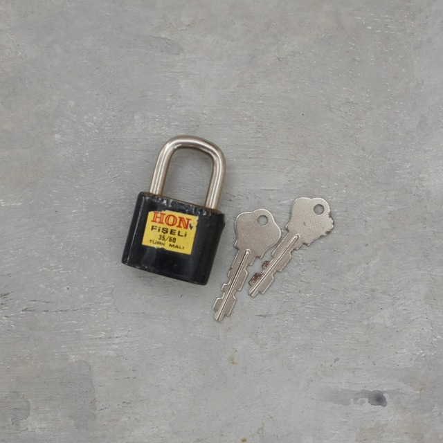 ヴィンテージ HON 南京錠 From Türkiye 実用とインテリア性を兼ね備えた雰囲気抜群アイテム 小物にもヴィンテージを スムーズに開閉できるカギ2本 横幅:約4cm 奥行き:約2cm 高さ:約6cm 重さ:約65g ※若干の採寸誤差はご容赦ください。 ヴィンテージ、アンティークと表記のある商品は すべて海外で買い付けてきた古いものです。 使用感、傷、汚れ、経年による変色の見られるものもございますが、 古いものならではの魅力としてお楽しみいただけますと幸いです。 気になる点、ご不明の点がありましたら、 ご購入前にお問い合わせください。 写真は自然光で撮影し、可能なかぎり実物に近い色味になるよう調整しておりますが、 撮影環境、モニターの環境設定により 実物と異なって感じられる場合がございます。 ご了承くださいませ。 オンラインストアで販売中の商品は 対面イベントで販売することもございます。 在庫状況は随時更新いたしますが、 ご購入のタイミングによっては商品をご用意できない場合がございます。 その際は誠に申し訳ございませんが、 ご注文をキャンセルさせていただきます。 ご不便をおかけしますが、ご理解のほどよろしくお願いいたします。
