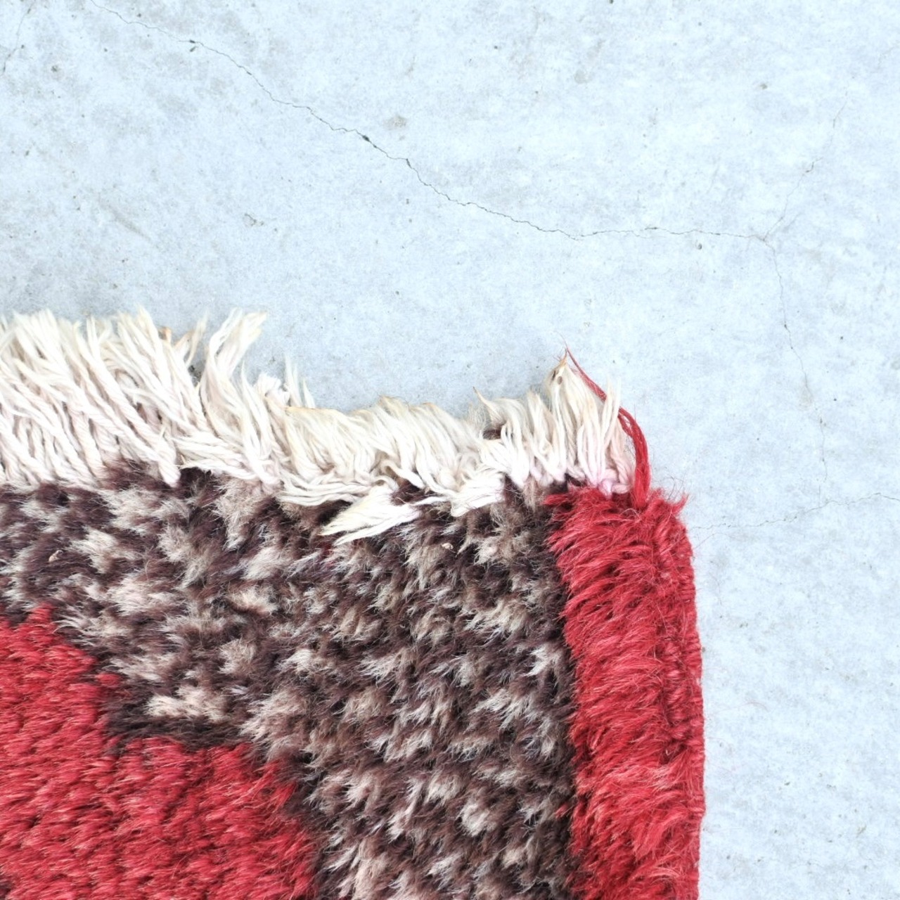 手織りのヴィンテージラグには使用感、傷、汚れ、経年による変色、補修跡、歪みの見られるものもございますが、