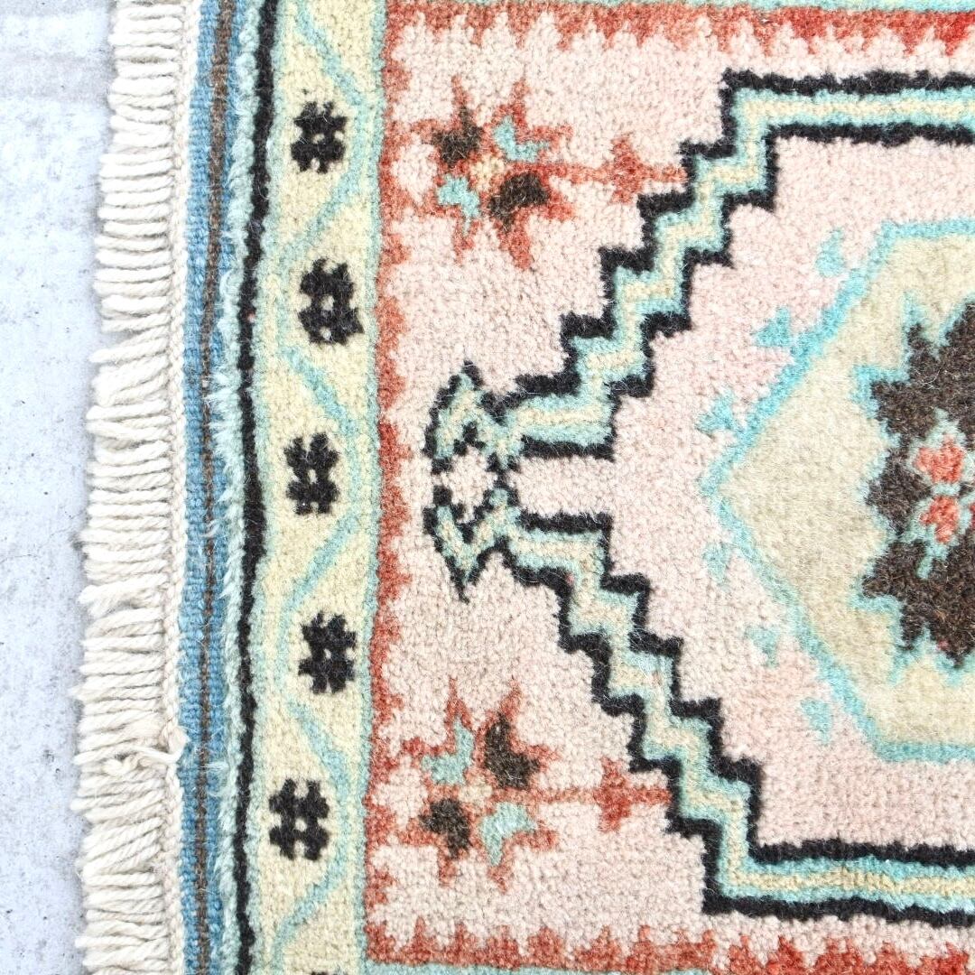 中央のメダリオンを含め全体のパステルカラーが可愛い印象のスモールラグ